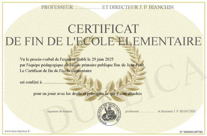 Envoyez par email votre Certificat de fin de l'école élémentaire personalisé
