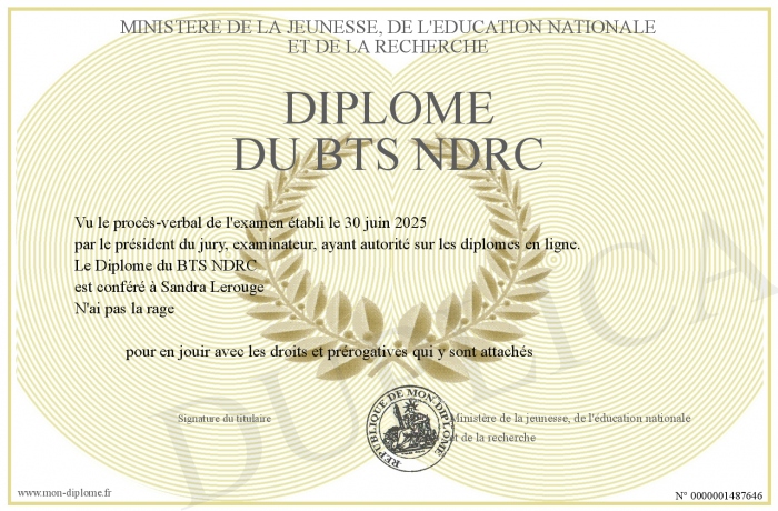 Envoyez par email votre Diplôme du BTS NDRC personalisé