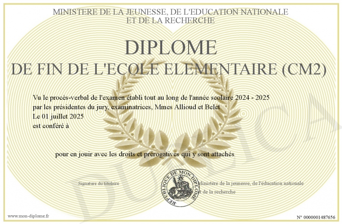 Envoyez par email votre Diplôme de fin de l'école élémentaire (CM2) personalisé