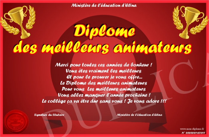 Envoyez par email votre Diplôme des meilleurs animateurs personalisé