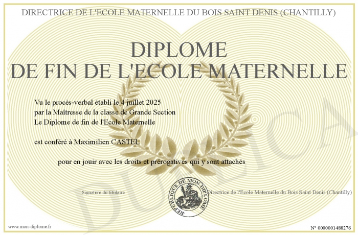 Envoyez par email votre Diplôme de fin de l'Ecole Maternelle personalisé
