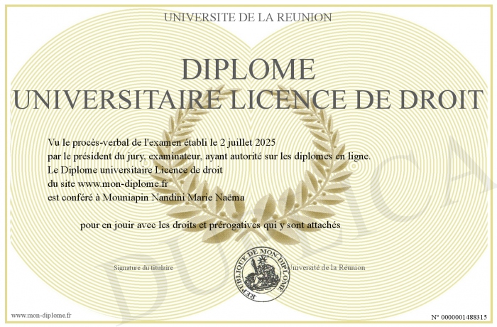 Envoyez par email votre Diplôme universitaire Licence de droit personalisé