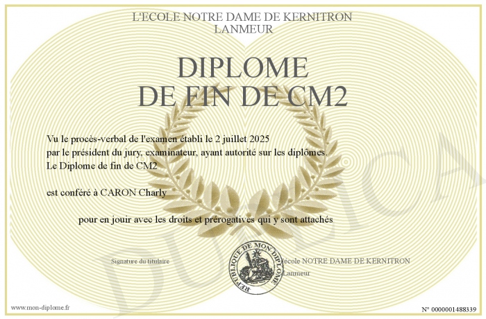 Envoyez par email votre Diplôme de fin de CM2 personalisé