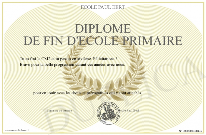 Envoyez par email votre Diplôme de fin d'école primaire personalisé