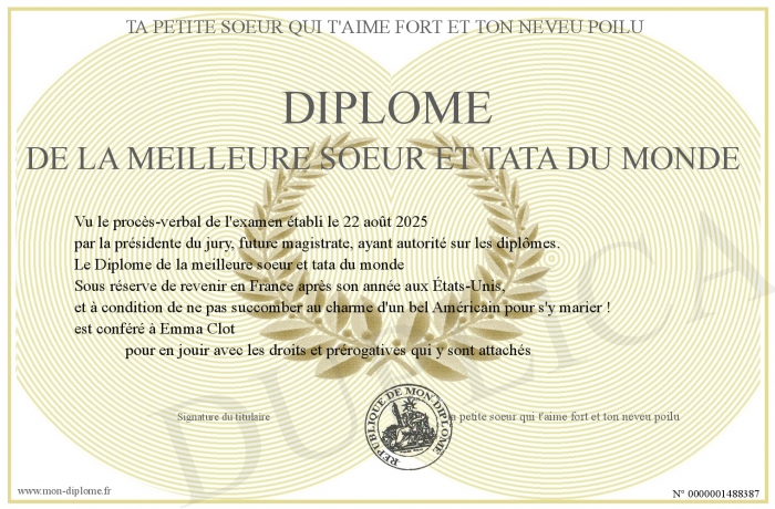 Envoyez par email votre Diplôme de la meilleure soeur et tata du monde personalisé