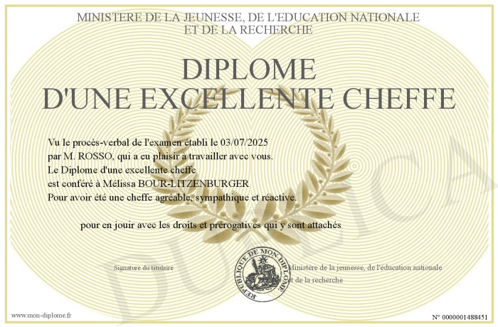 Envoyez par email votre Diplôme d'une excellente cheffe personalisé