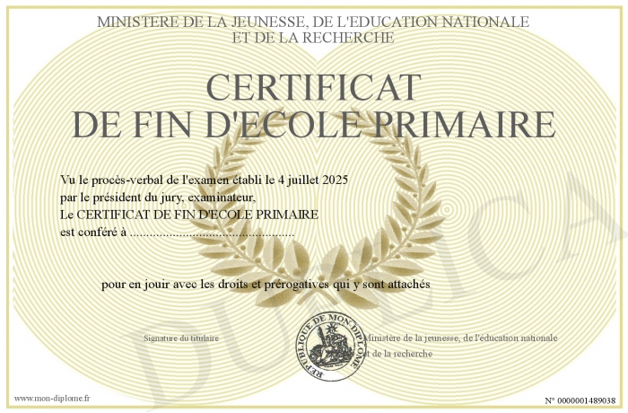 Envoyez par email votre CERTIFICAT DE FIN D'ECOLE PRIMAIRE personalisé