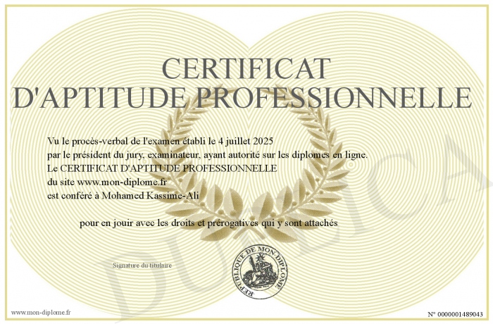 Envoyez par email votre CERTIFICAT D'APTITUDE PROFESSIONNELLE personalisé