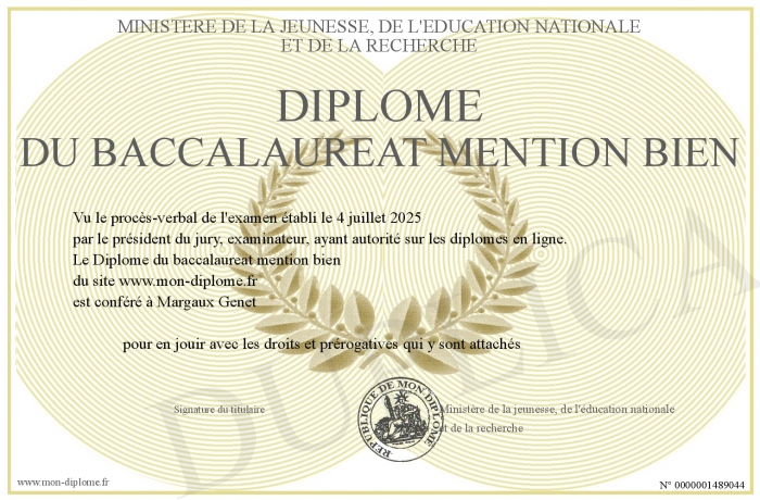 Envoyez par email votre Diplôme du baccalaureat mention bien personalisé