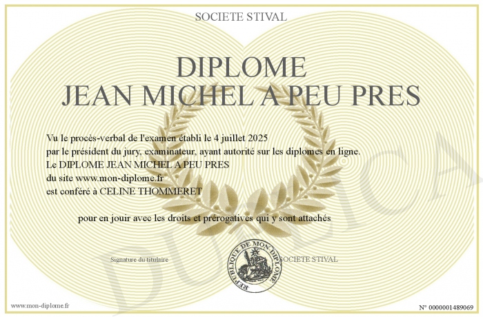 Envoyez par email votre DIPLOME JEAN MICHEL A PEU PRES personalisé
