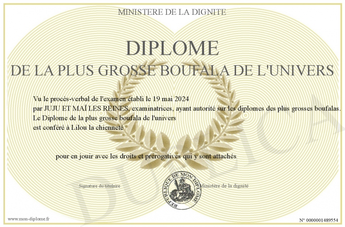 Envoyez par email votre Diplôme de la plus grosse boufala de l'univers personalisé