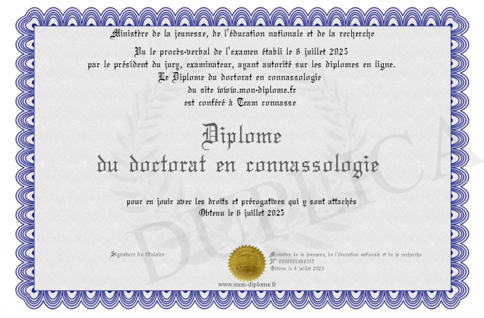 Envoyez par email votre Diplôme du doctorat en connassologie personalisé