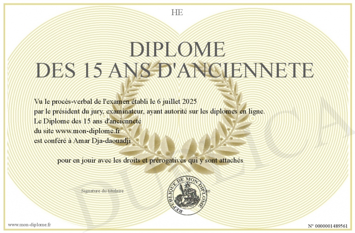 Envoyez par email votre Diplôme des 15 ans d'ancienneté personalisé
