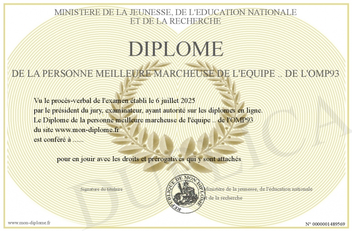 Envoyez par email votre Diplôme de la personne meilleure marcheuse de l'équipe .. de l'OMP93 personalisé
