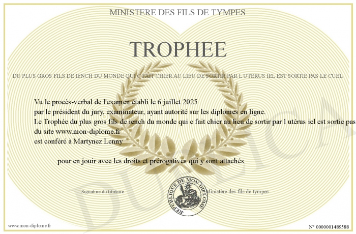 Envoyez par email votre Trophée du plus gros fils de iench du monde qui c fait chier au lieu de sortir par l utérus iel est sortie pas le cuel personalisé