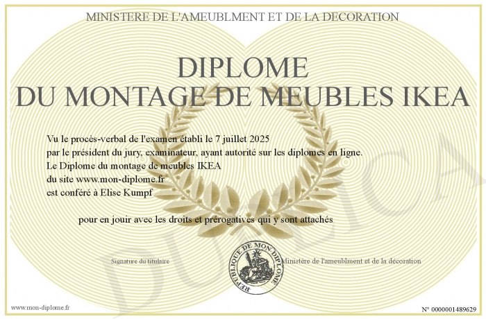 Envoyez par email votre Diplome du montage de meubles IKEA personalisé