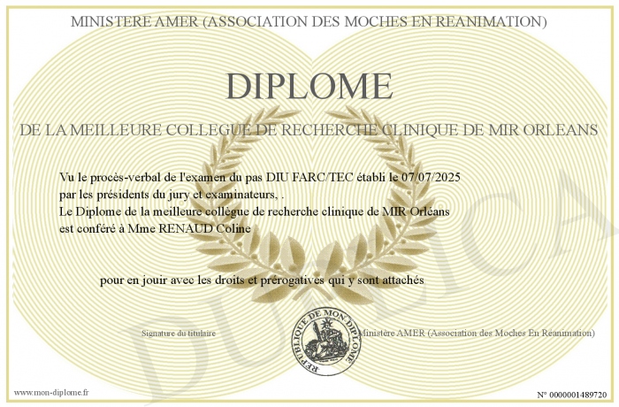 Envoyez par email votre Diplôme de la meilleure collègue de recherche clinique de MIR Orléans personalisé
