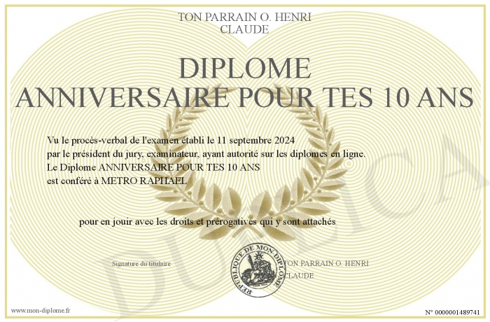 Envoyez par email votre Diplôme ANNIVERSAIRE POUR TES 10 ANS personalisé