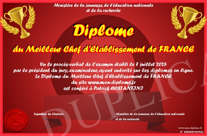 Envoyez par email votre Diplôme du Meilleur Chef d'Etablissement de FRANCE personalisé