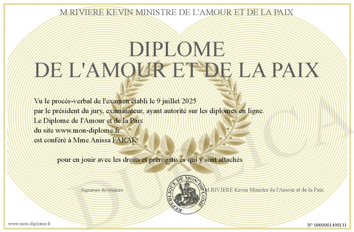 Envoyez par email votre Diplôme de l'Amour et de la Paix personalisé