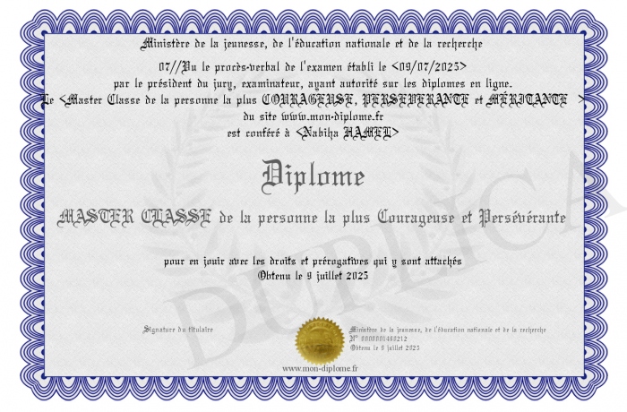Envoyez par email votre Diplôme MASTER CLASSE de la personne la plus Courageuse et Persévérante personalisé