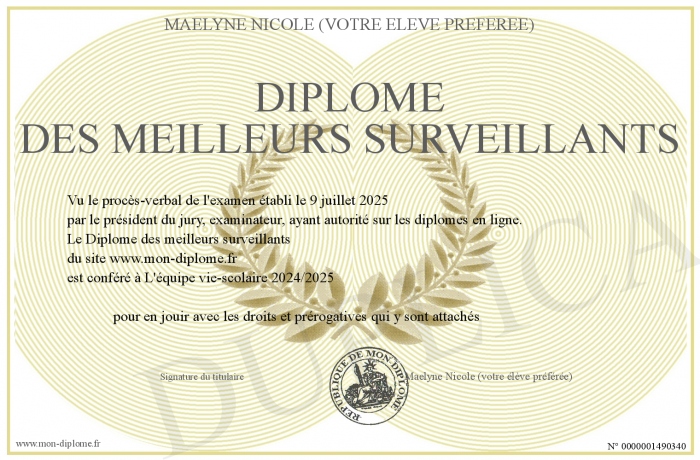 Envoyez par email votre Diplôme des meilleurs surveillants personalisé