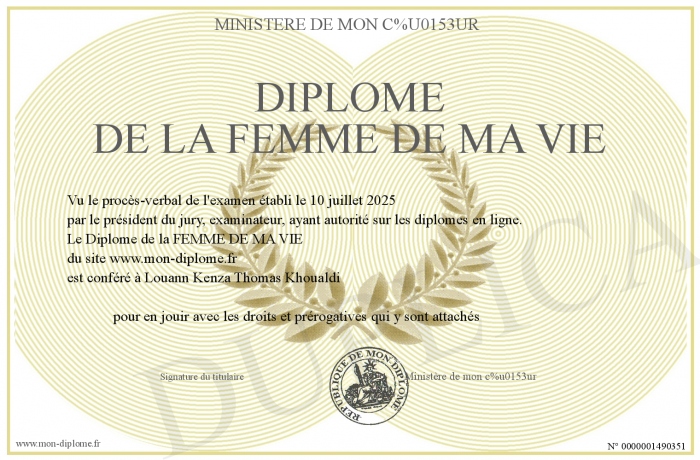 Envoyez par email votre Diplôme de la FEMME DE MA VIE personalisé