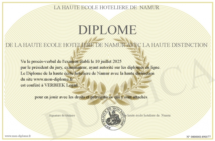 Envoyez par email votre Diplôme de la haute école hoteliere de Namur avec la haute distinction personalisé