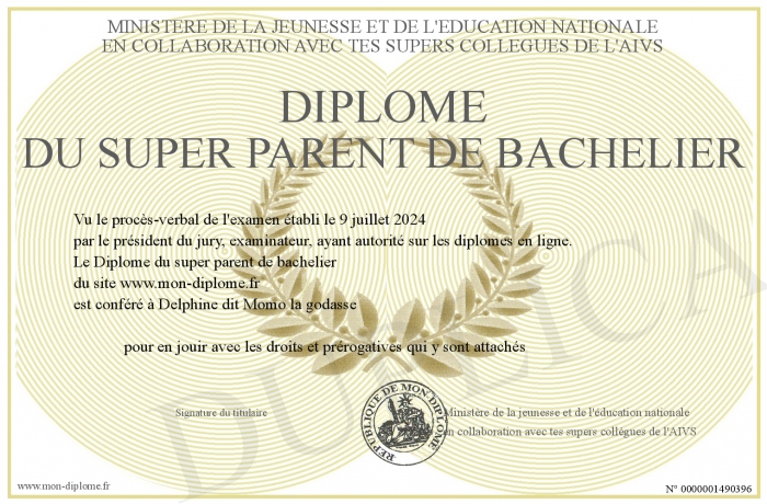 Envoyez par email votre Diplôme du super parent de bachelier personalisé