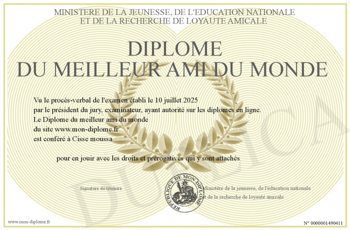 Envoyez par email votre Diplôme du meilleur ami du monde personalisé