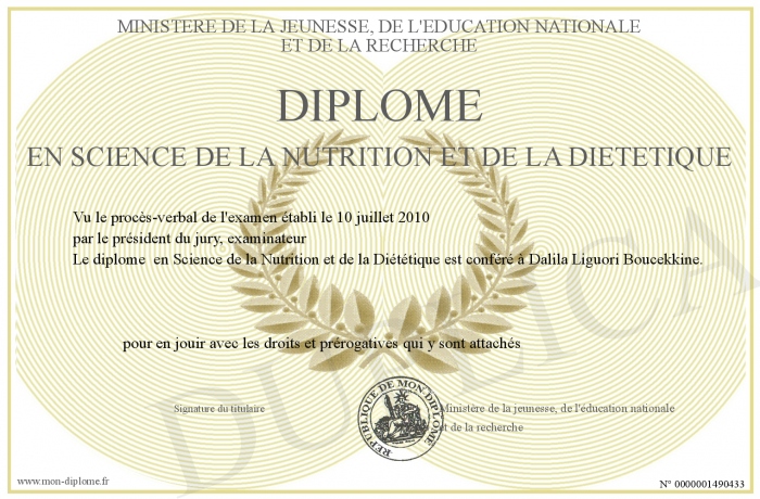 Envoyez par email votre diplome en Science de la Nutrition et de la Diététique personalisé