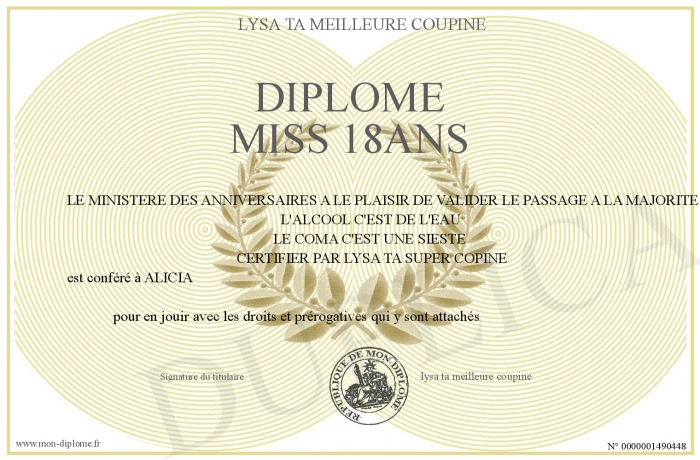 Envoyez par email votre Diplôme MISS 18ANS personalisé