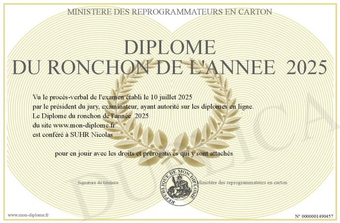Envoyez par email votre Diplôme du ronchon de l'année 2025 personalisé