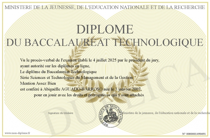Envoyez par email votre Diplôme du baccalauréat technologique personalisé