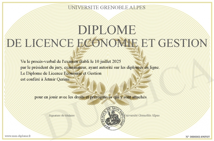 Envoyez par email votre Diplôme de Licence Economie et Gestion personalisé