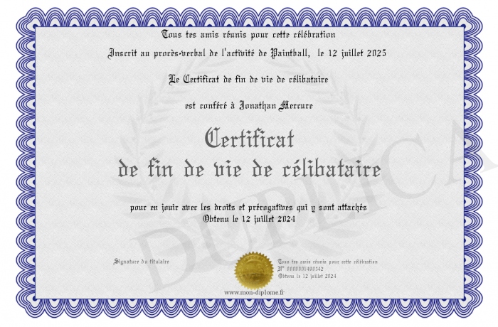 Envoyez par email votre Certificat de fin de vie de célibataire personalisé
