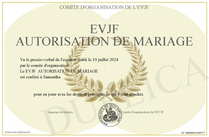 Envoyez par email votre EVJF AUTORISATION DE MARIAGE personalisé