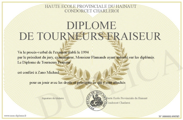 Envoyez par email votre Diplôme de Tourneurs Fraiseur personalisé