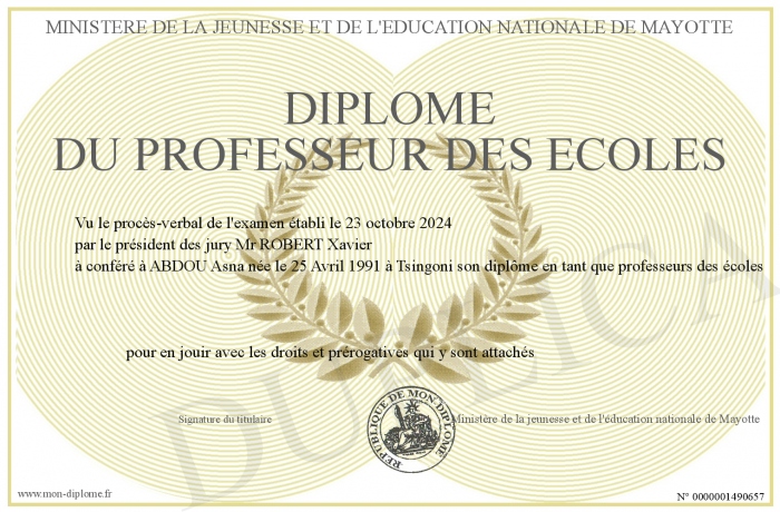 Envoyez par email votre Diplôme du Professeur des Ecoles personalisé