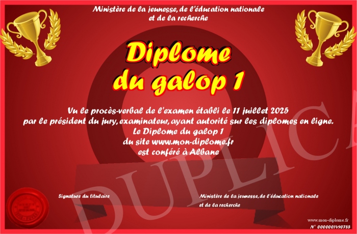 Envoyez par email votre Diplôme du galop 1 personalisé