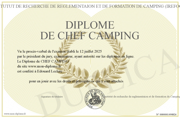 Envoyez par email votre Diplôme de CHEF CAMPING personalisé