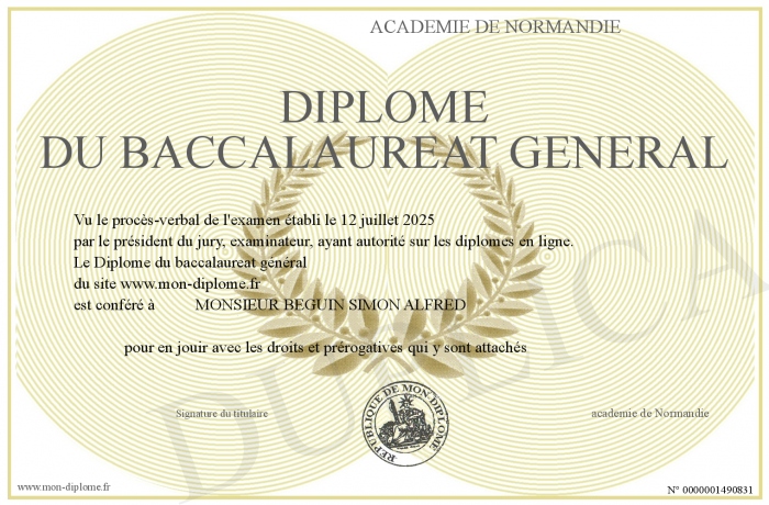 Envoyez par email votre Diplôme du baccalaureat général personalisé