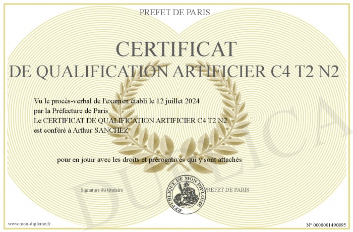 Envoyez par email votre CERTIFICAT DE QUALIFICATION ARTIFICIER C4 T2 N2 personalisé