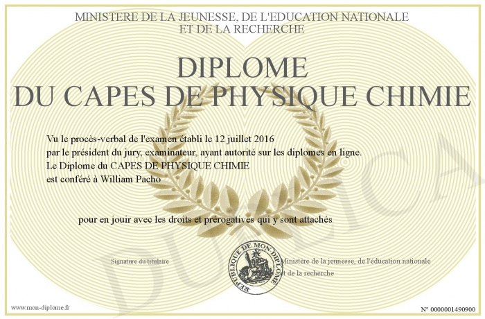 Envoyez par email votre Diplôme du CAPES DE PHYSIQUE CHIMIE personalisé
