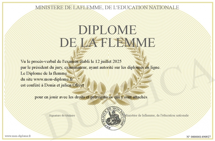 Envoyez par email votre Diplôme de la flemme personalisé