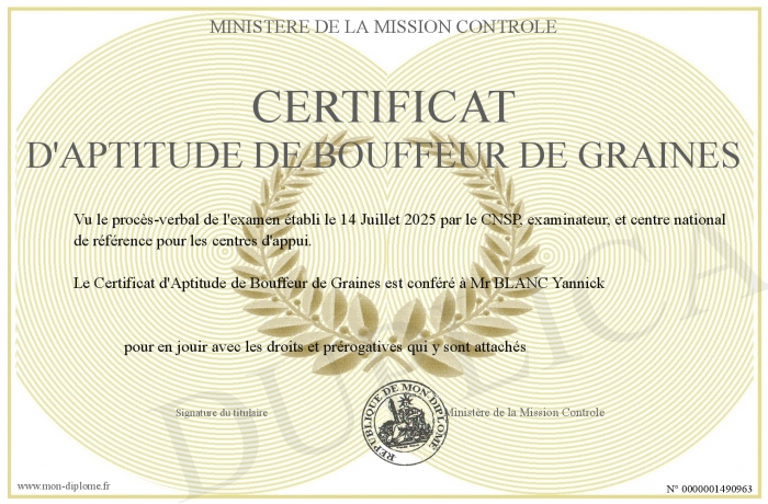 Envoyez par email votre Certificat d'Aptitude de Bouffeur de Graines personalisé