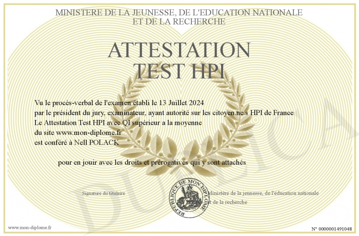 Envoyez par email votre Attestation Test HPI personalisé