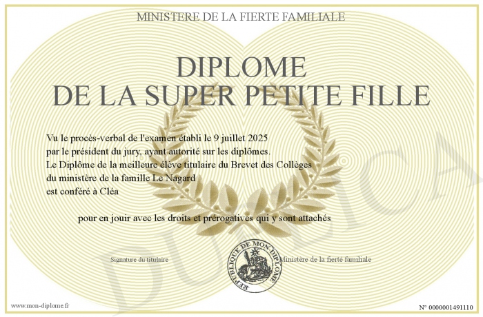 Envoyez par email votre Diplôme de la super petite fille personalisé