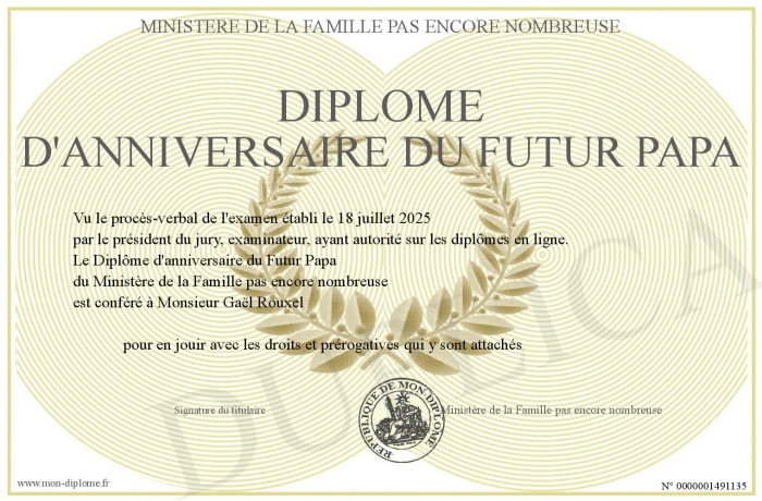 Envoyez par email votre Diplôme d'anniversaire du Futur Papa personalisé