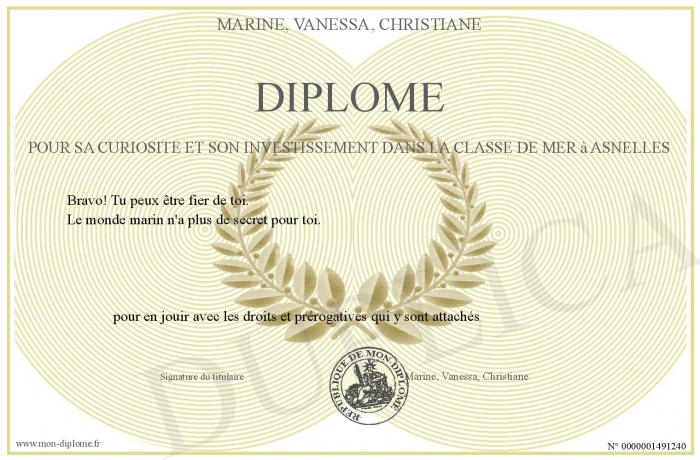 Envoyez par email votre Diplôme pour sa curiosité et son investissement dans la classe de mer à Asnelles personalisé